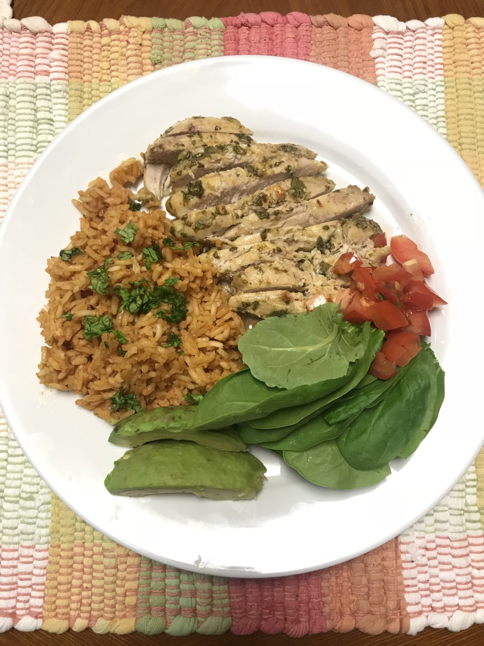 Note: I poor the marinade over the chicken and cover it to keep more moisture and flavor in the chicken when cooking. I served this delicious chicken with Spanish rice, avocado, greens and tomatoes. I made homemade Spanish rice, but am still working on perfecting the flavor. When I do, I will share it with you!