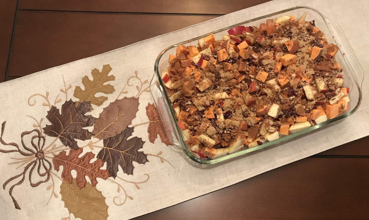 2. In an oven safe 9×13 dish, mix sweet potatoes and apples together.