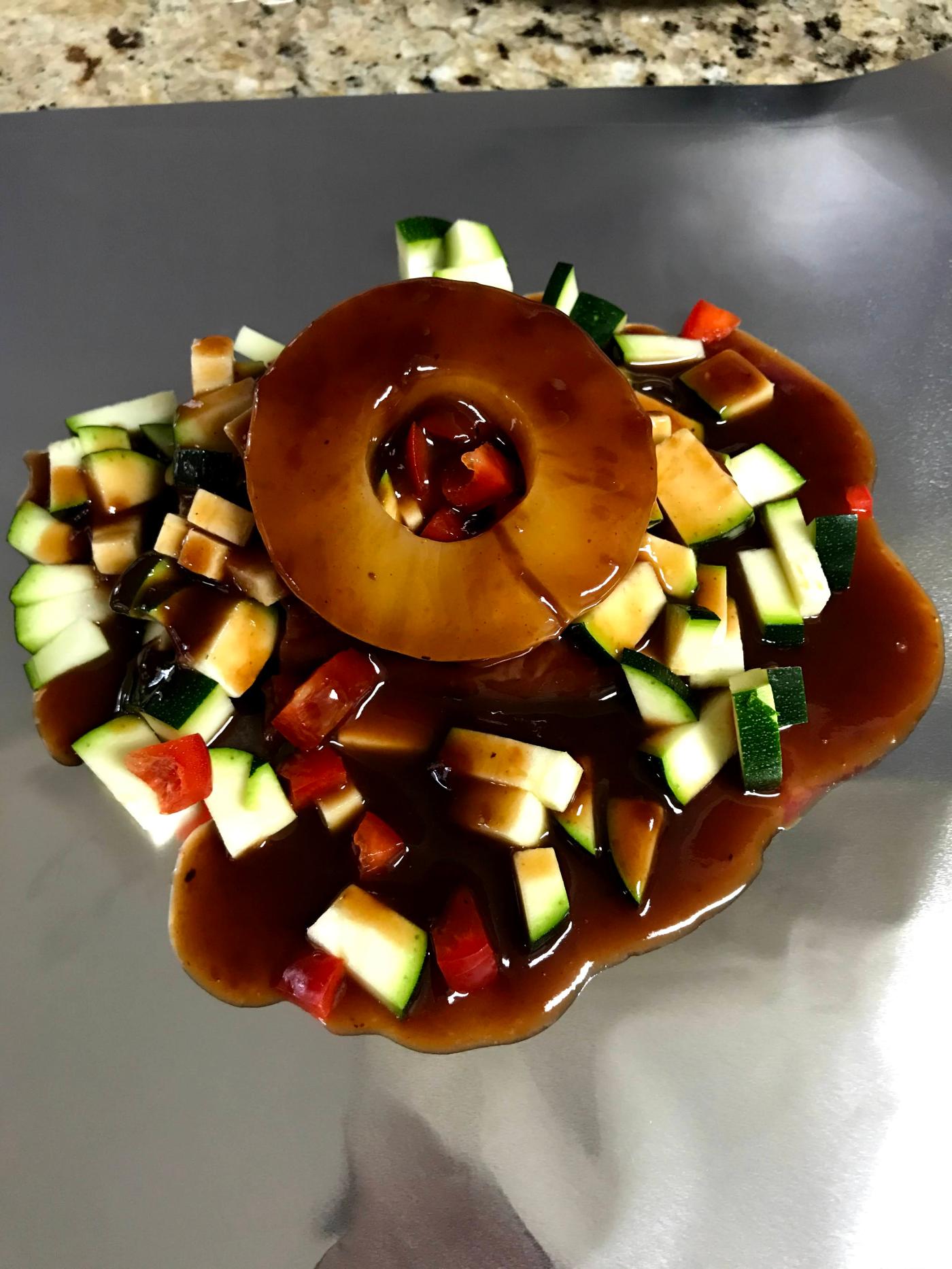 - Place venison in the center of you foil sheet. Top with zucchini, bell peppers and garlic. Place pineapple ring on top of meat and veggie mixture.