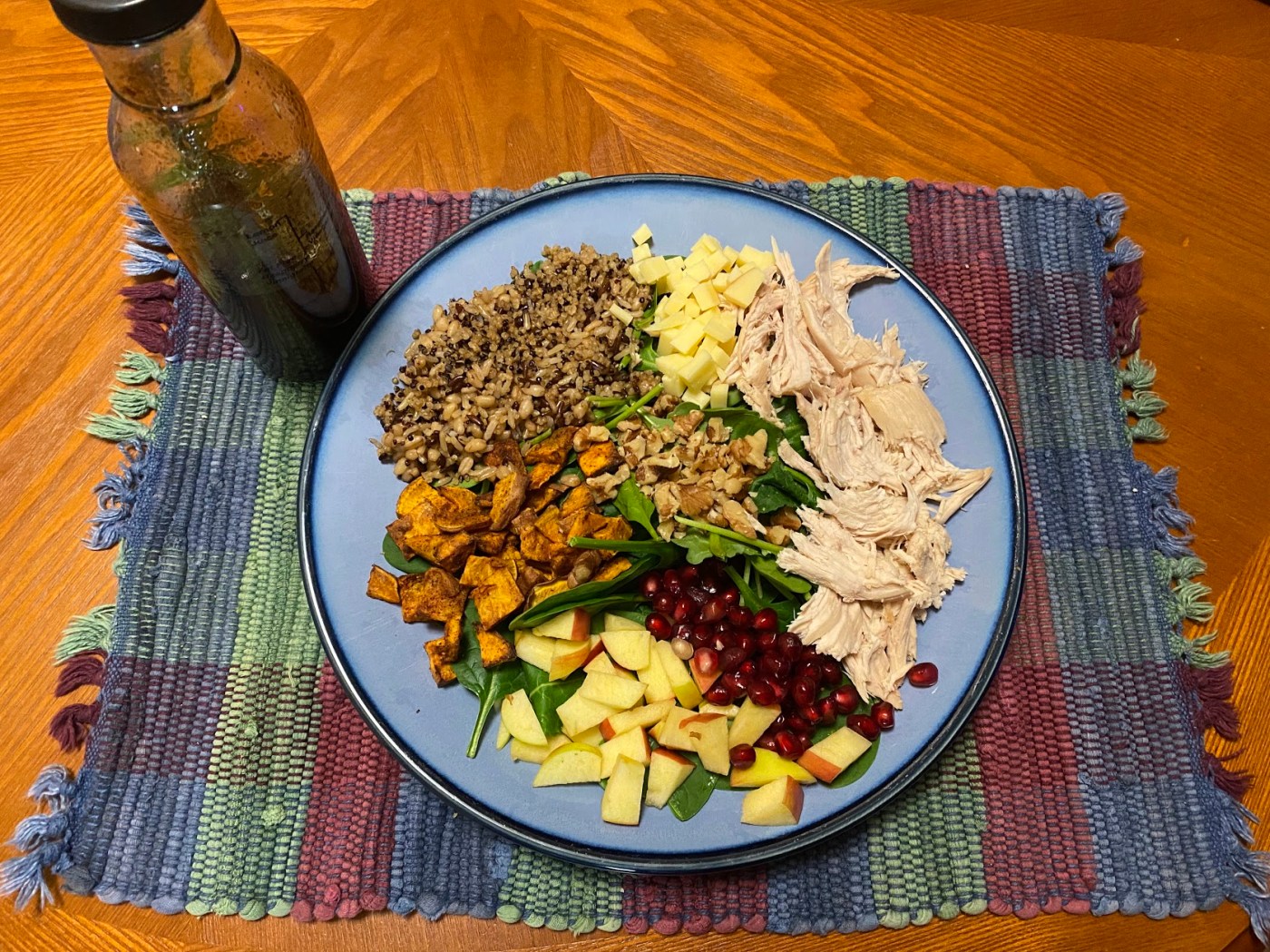 - Top greens with 7 grain mixture, roasted sweet potatoes, shredded chicken, diced apple, pomegranate seeds, cubed cheese and walnuts.