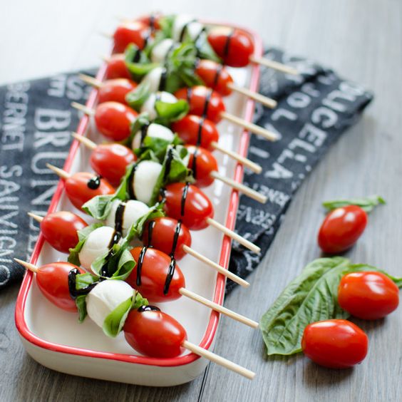 Ingredients Tomatoes, cut in half Mozzarella balls, fresh Fresh Bail Balsamic Vinegar Directions Skewer in this order: one tomato half, mozzarella ball, basil leaf and second tomato half. Once all ingredients are skewered, drizzle with balsamic vinegar and serve cold. Photo curtsy of http://www.personallyandrea.com.